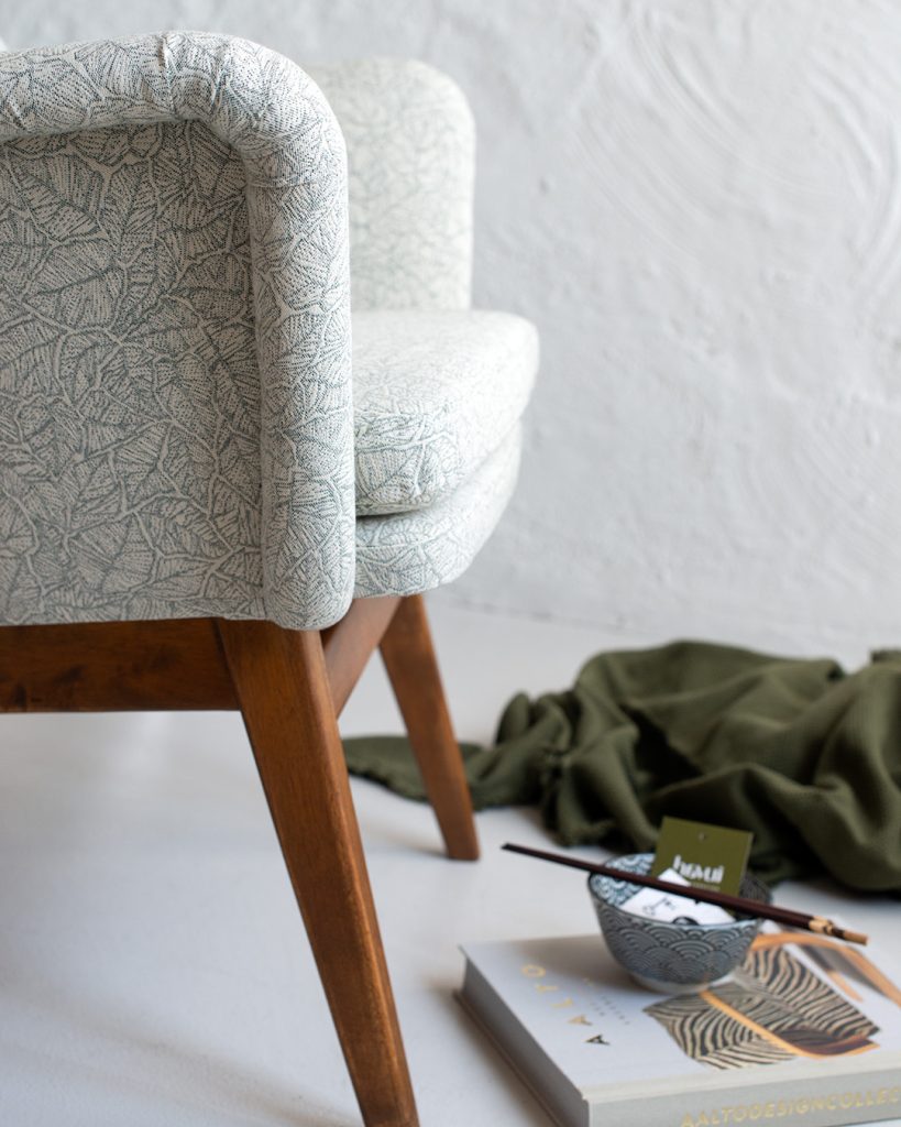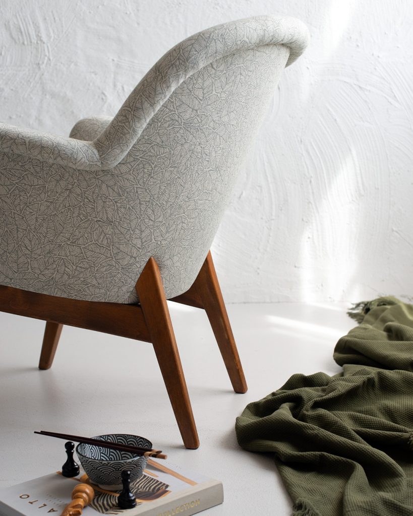 Siro, kaarevaselkäinen 50-luvun nojatuoli sai ylleen kesäasun. Raikas vihreävalkoinen Ruska-kuosi oli nappivalinta tummien puuosien kaveriksi. Vanha verhoilu istui varsin huonosti ja uusi nuttu vaatikin uudelleen kaavoituksen. Verhoilun ohella nojatuolista vaihdettiin kaikki pehmusteet, lisäksi puuosat saivat uutta eloa puuvahalla.