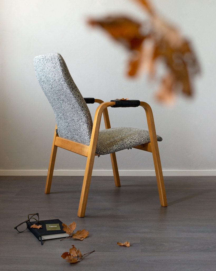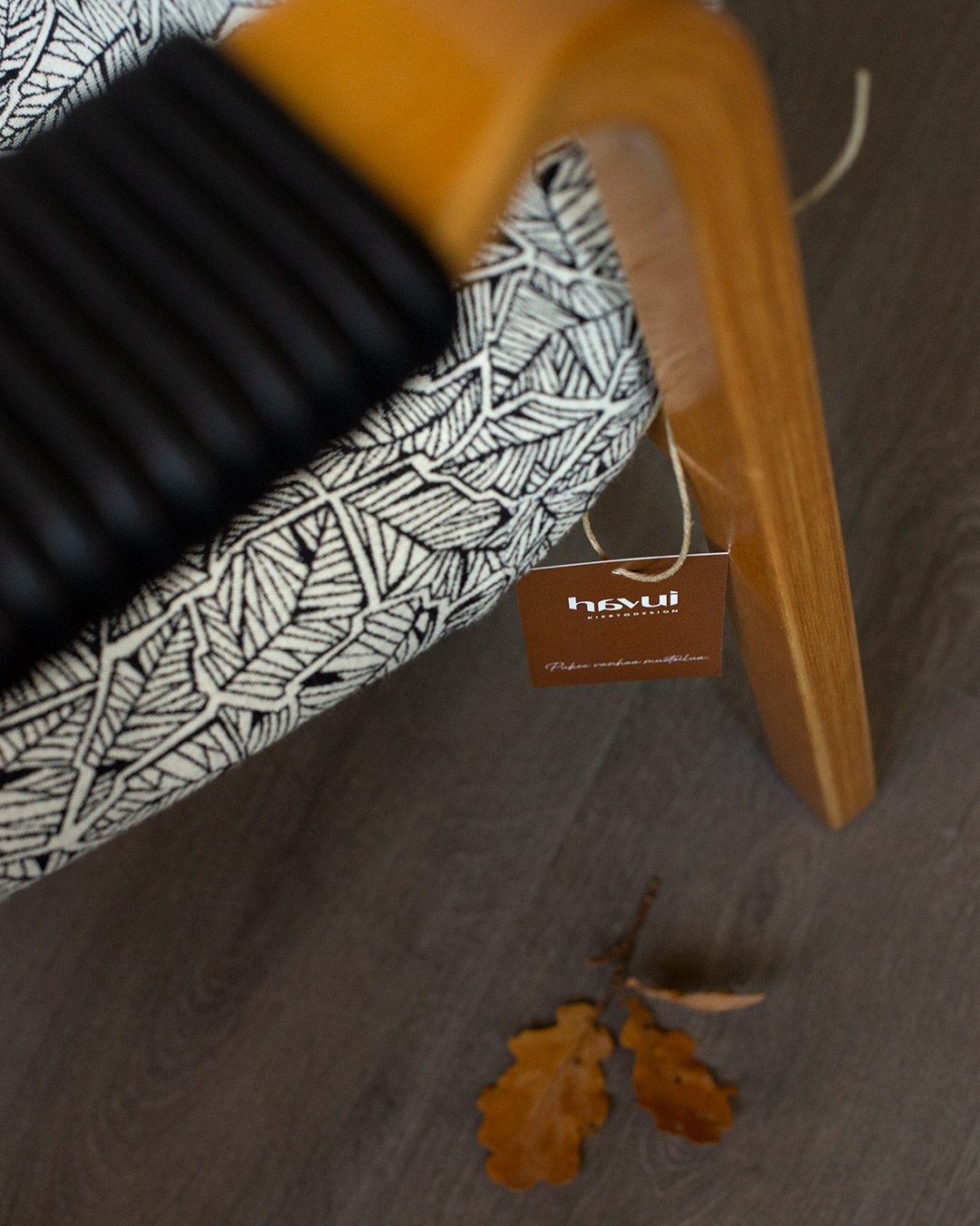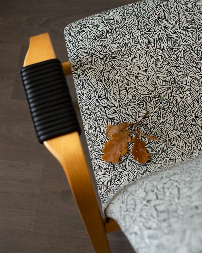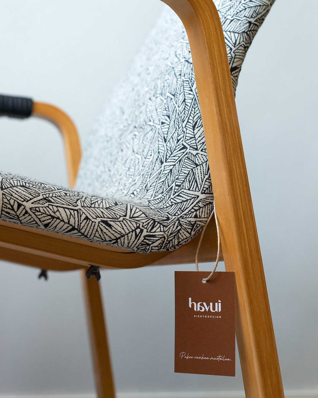 Linjakas Columna-nojatuoli saapui Havuin varastolle alkuperäisessä asussaan ja jatkoi matkaansa kauttaaltaan päivitettynä. Pehmustus uusittiin ja puuosat pintakäsiteltiin värittömällä sellakalla. Kylkeensä nojatuoli sai Havui-kuosin mustavalkoisena. Käsinojiin tehtiin nahkanyöripunos, joka antaa tuolille kivasti särmää.
