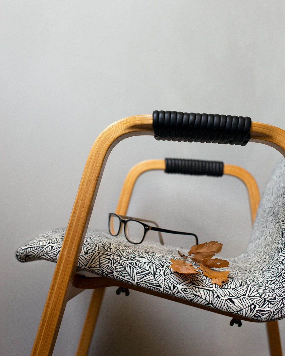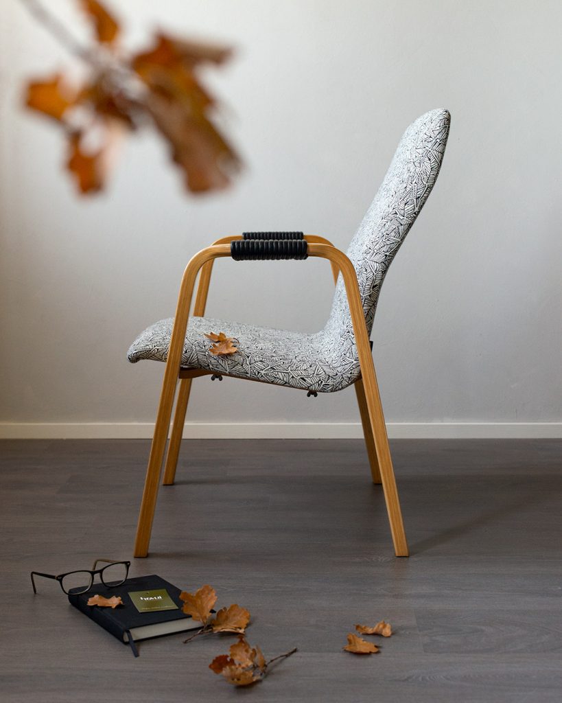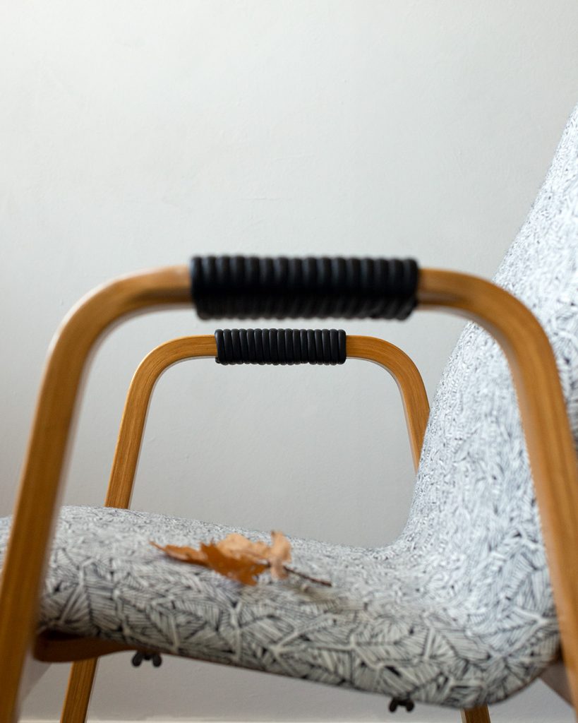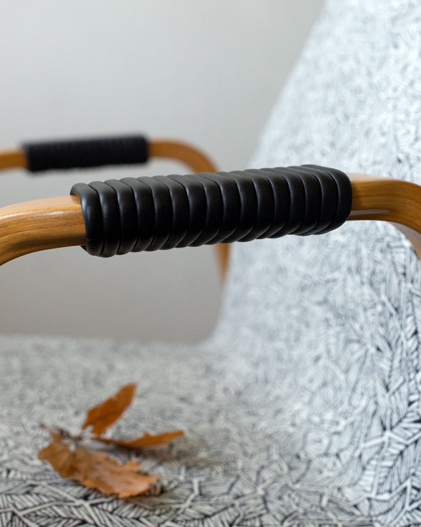 Linjakas Columna-nojatuoli saapui Havuin varastolle alkuperäisessä asussaan ja jatkoi matkaansa kauttaaltaan päivitettynä. Pehmustus uusittiin ja puuosat pintakäsiteltiin värittömällä sellakalla. Kylkeensä nojatuoli sai Havui-kuosin mustavalkoisena. Käsinojiin tehtiin nahkanyöripunos, joka antaa tuolille kivasti särmää.