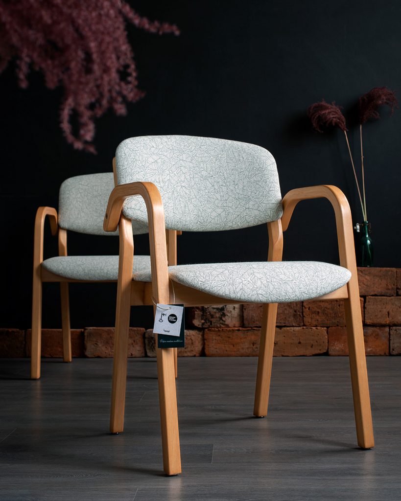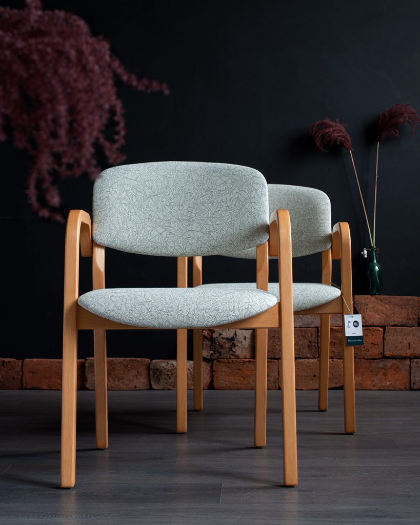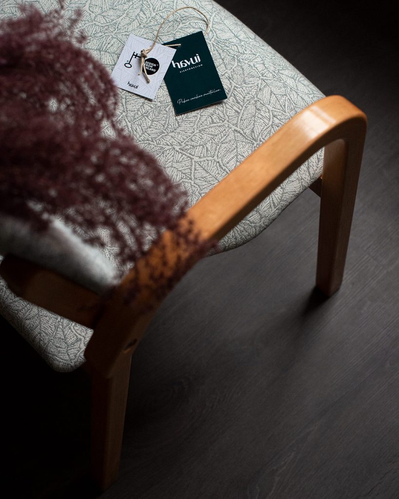 Aalto-henkiset Martelan toimistotuolit saivat Havuilla kylkeensä vihreävalkoisen Ruska-kuosin sekä uuden pehmustuksen. Istuinten puuosat olivat tosi priimassa kunnossa, eikä niille kaivattukaan mitään muutosta.
