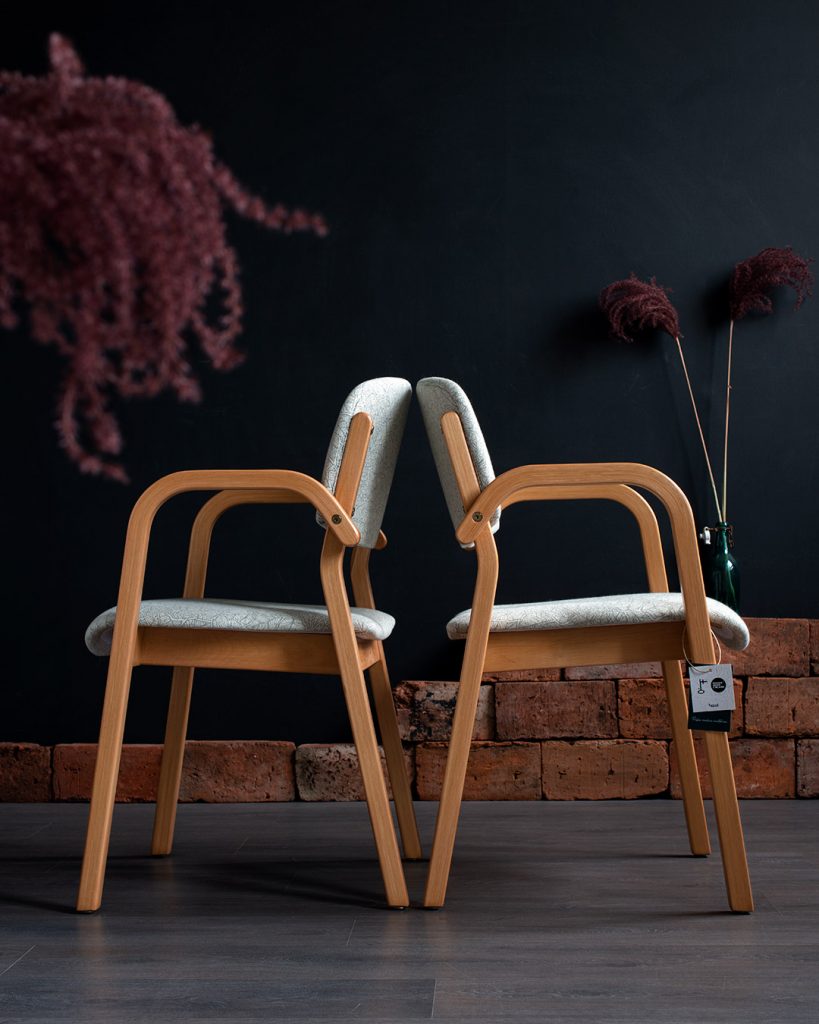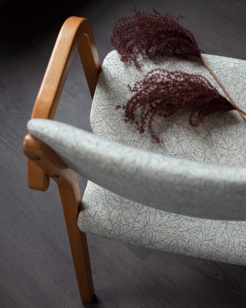 Jännää miten välillä joku tietty kuosi ja väri tuntuu olevan työpöydällä toistuvasti. Nyt syksyllä onkin kääräisty useamman nojatuolin niskaan Ruskaa sävyssä pullonvihreä/valkoinen. Jokaisen tuolin yllä kuosi on kuitenkin aina erilainen, riippuen istuinrungon materiaalista, sävystä ja muotokielestä.