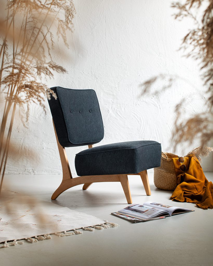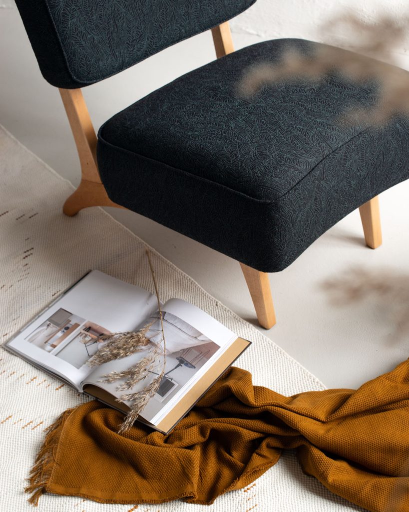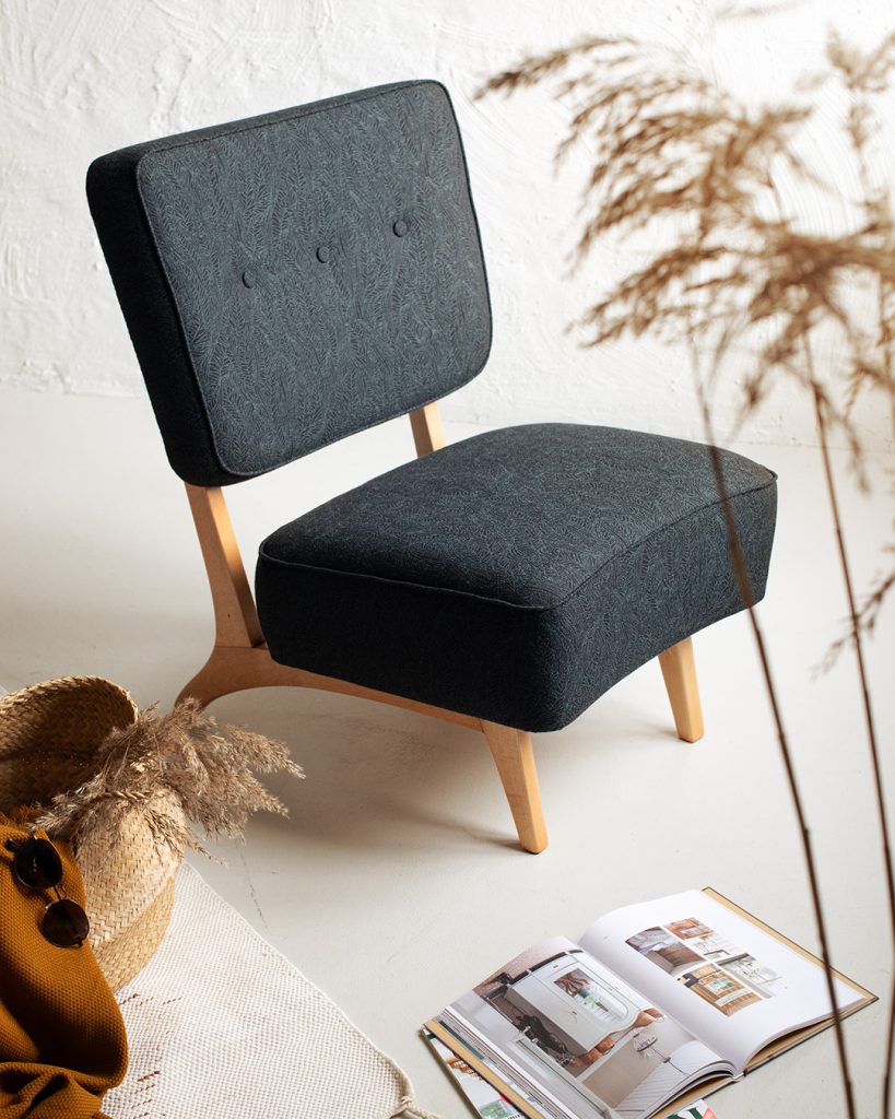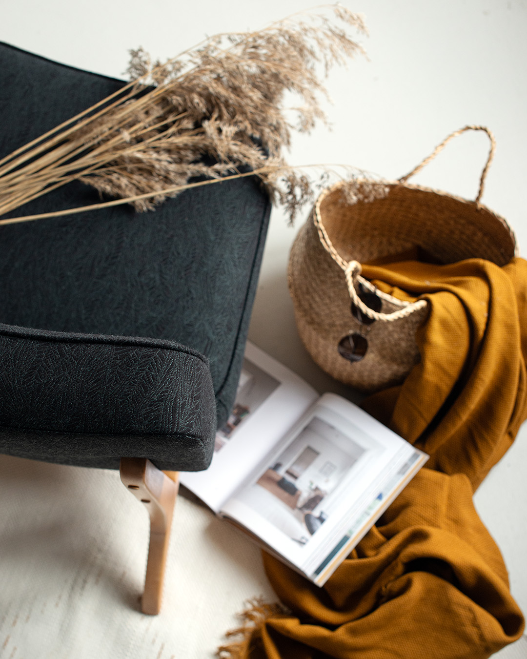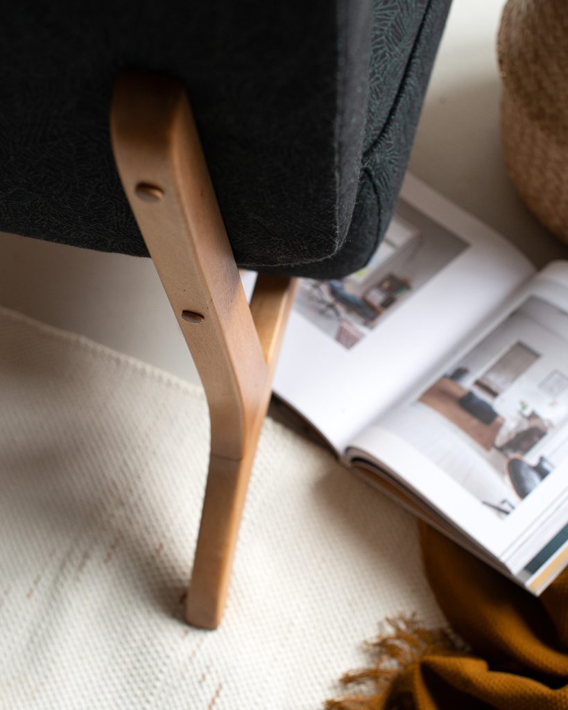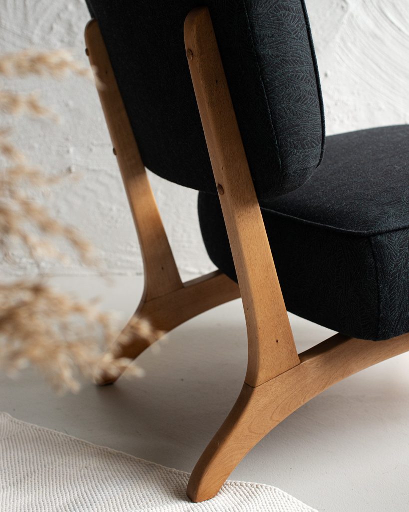 1950-luvulla suunniteltu, Lahden Lepokaluston valmistama Susanna-nojatuoli sai kokonaisvaltaisesti uutta ylleen. Tuolin perustus ja pehmustus rakennettiin täysin uudelleen. Istuimen puurunko hiottiin ja pintakäsiteltiin. Alkuperäinen, kirsikan punaiseen taittuva kova lakkakerros sai väistyä uuden, pehmeämmän ruskean sävyn alta, joka jättää pyyn syyt kauniisti näkyviin. Istuimen pintaan valikoitui Korsikko-kuosi väreissä salvianvihreä-musta. Kankaan kuvio tukee vahvasti istuinrungon upeaa muotokieltä.