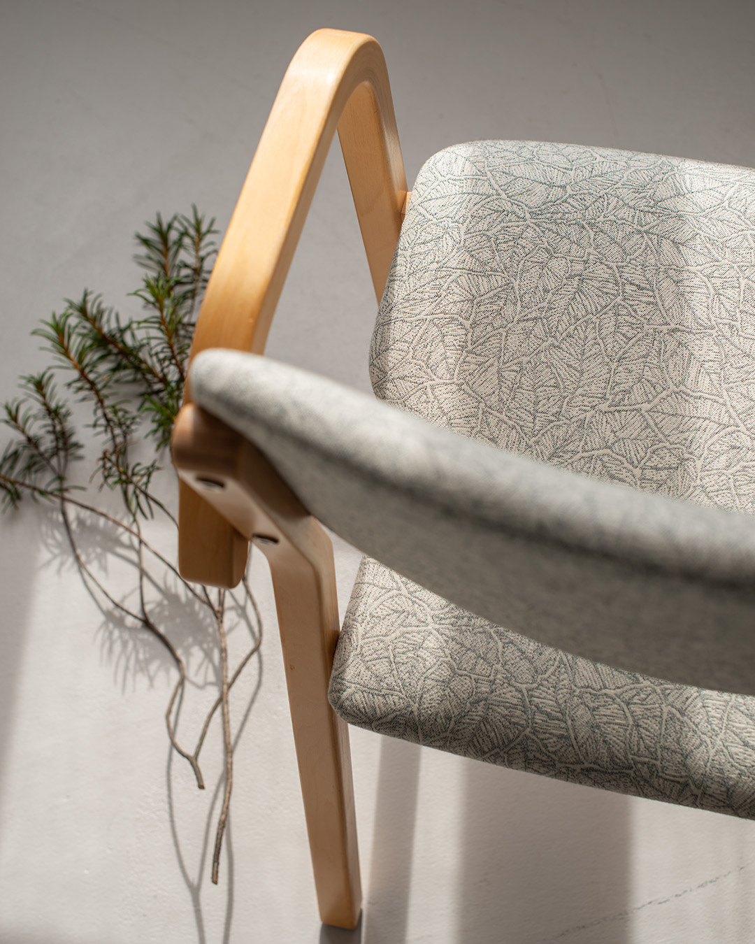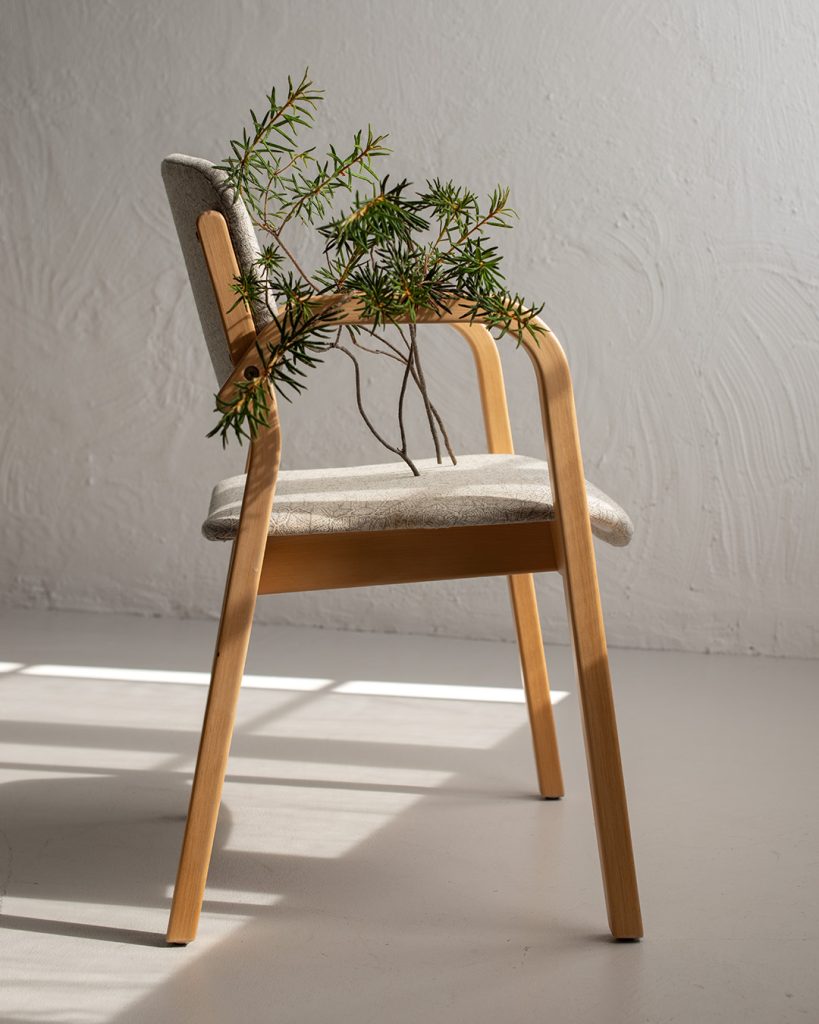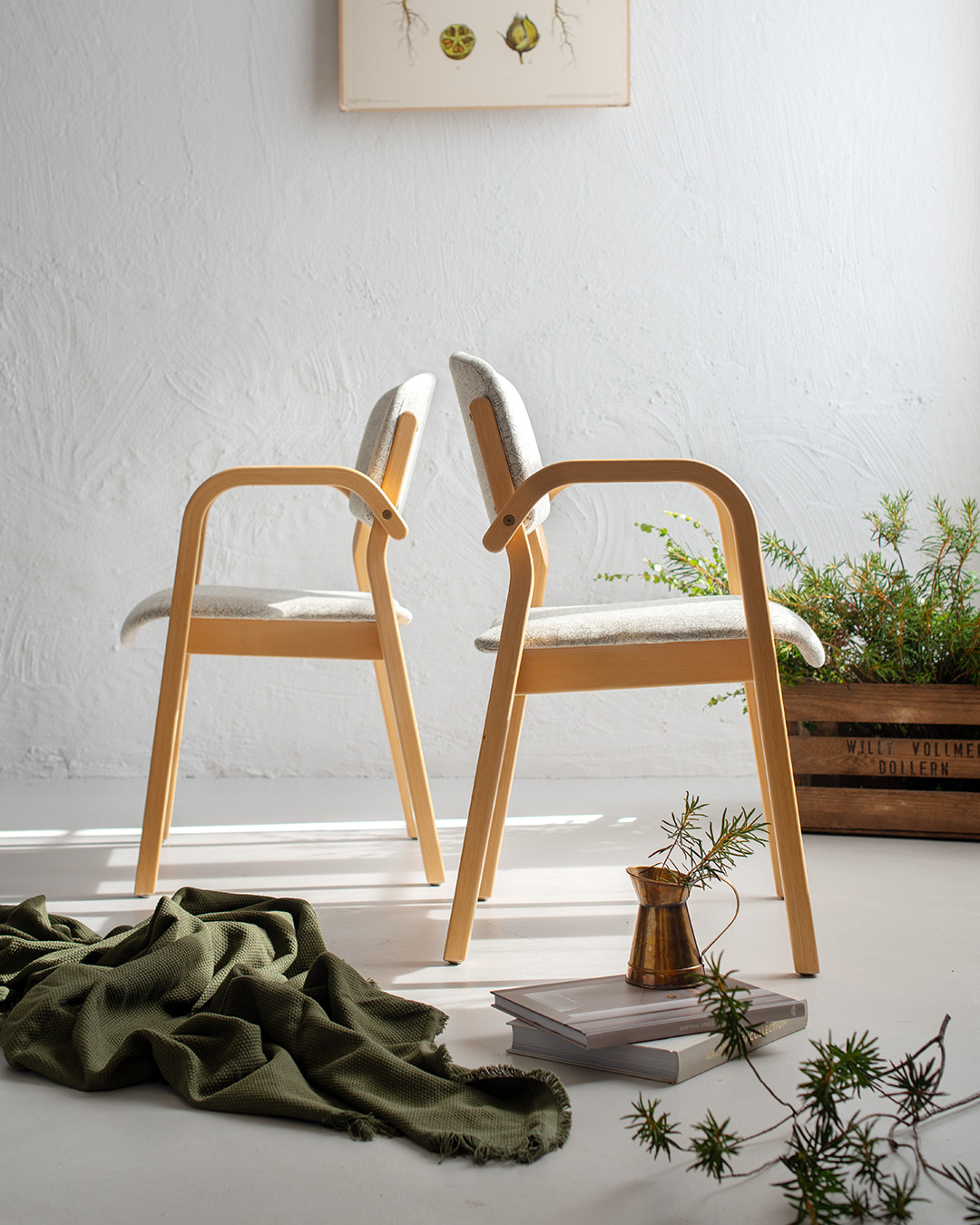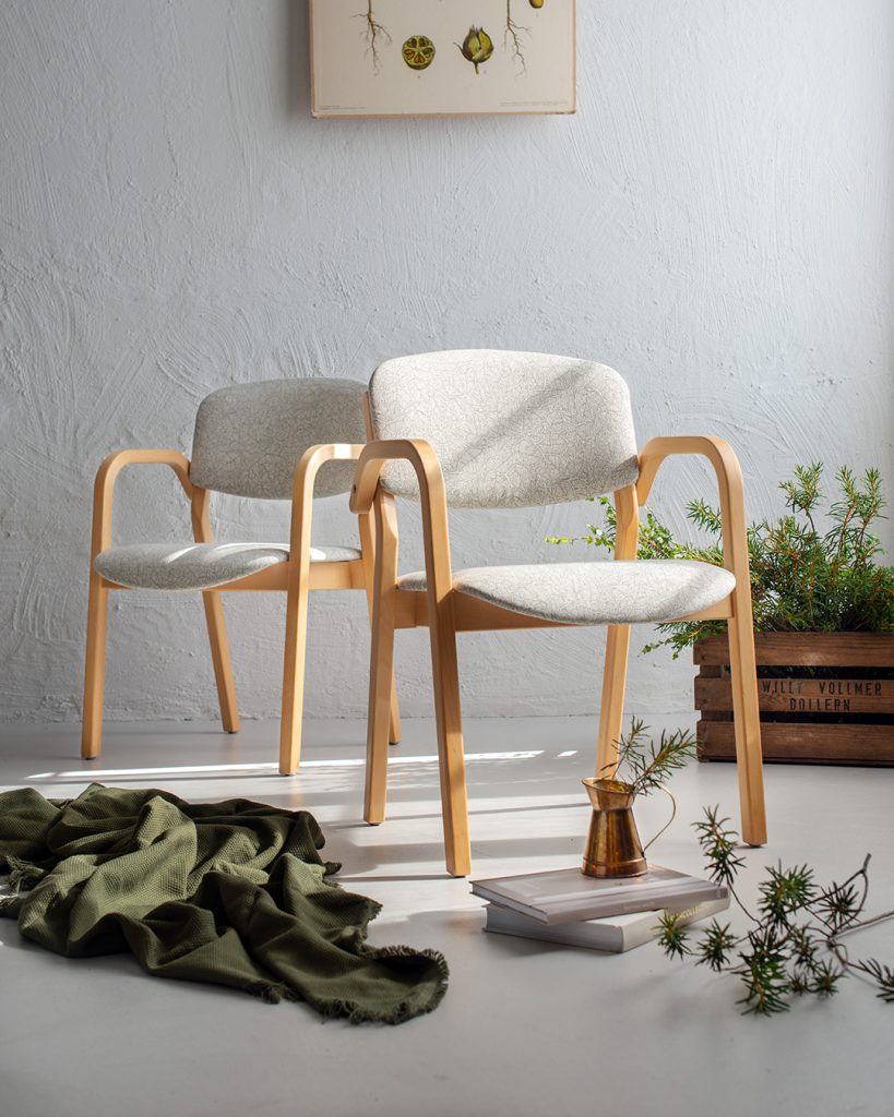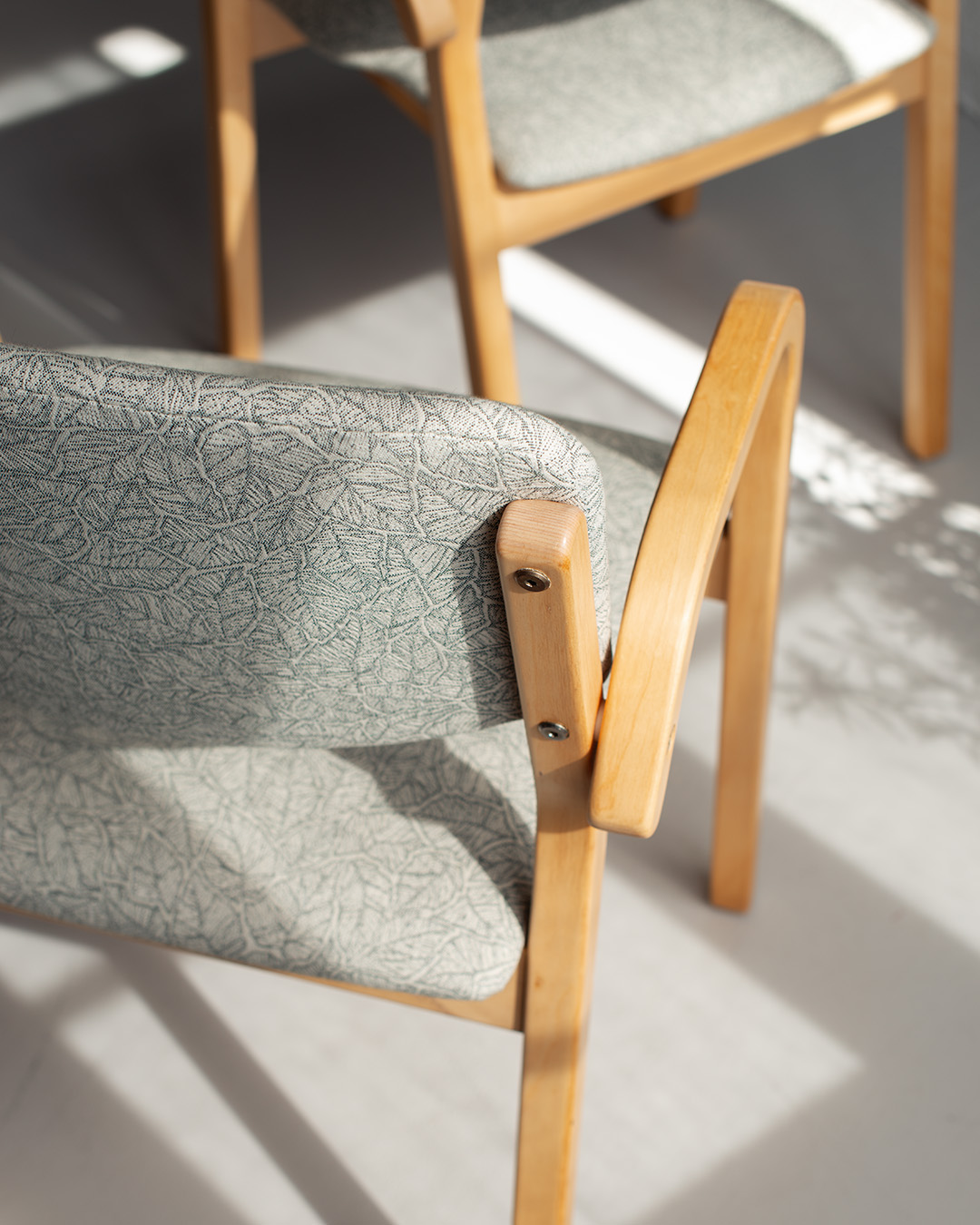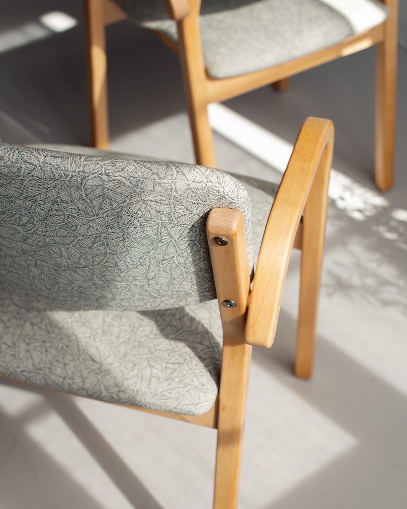 Tuolit saivat ylleen edeltäjiensä mukaisesti Ruska-kuosin sävyissä pullonvihreä/valkoinen sekä täysin uudet pehmusteet. Puuosat freesattiin puuöljyllä. Ja taas riittää puhtia virkatehtäviin. Tuolit kotiutuivat heti kunnostustyön valmistuttua.