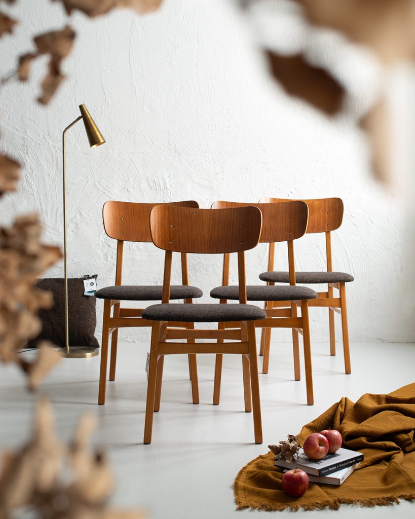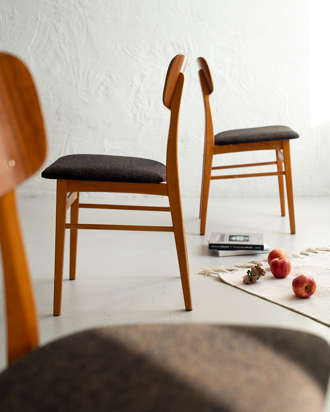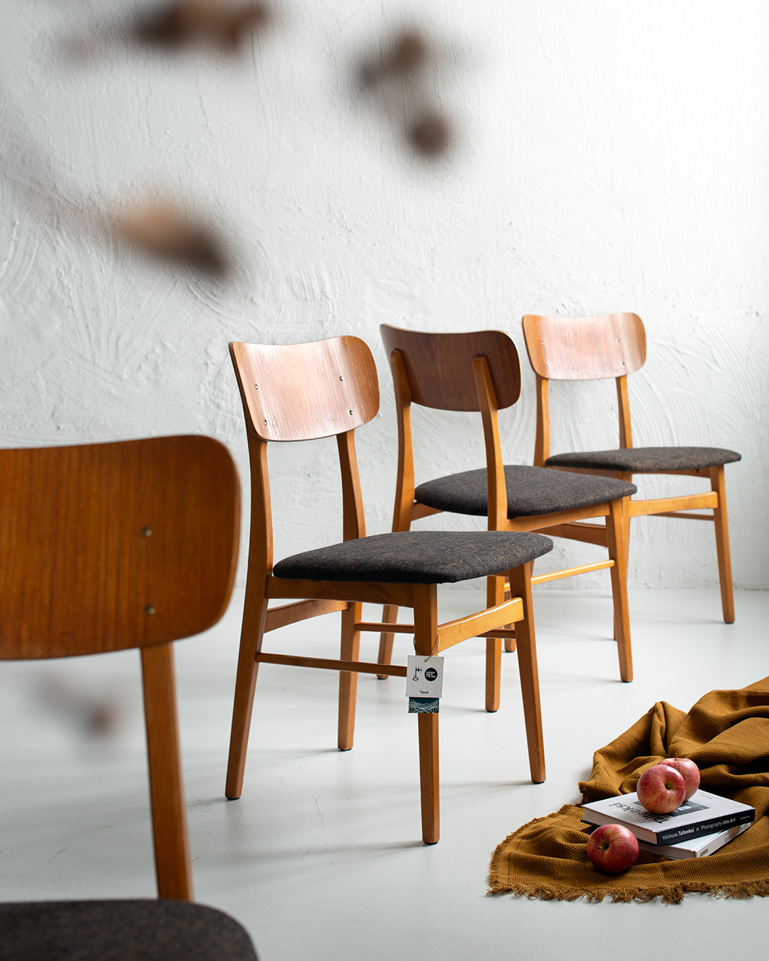 Tuolinelikko 50/60-luvun vaihteesta sai uutta ylleen ja syvyyttä puupinnoille. Istuimet verhoiltiin Havui-kuosilla väreissä curry/musta. Lisäksi pehmusteet vaihdettiin uusiin ja puuosat kirkastettiin sellakalla/puuöljyllä.