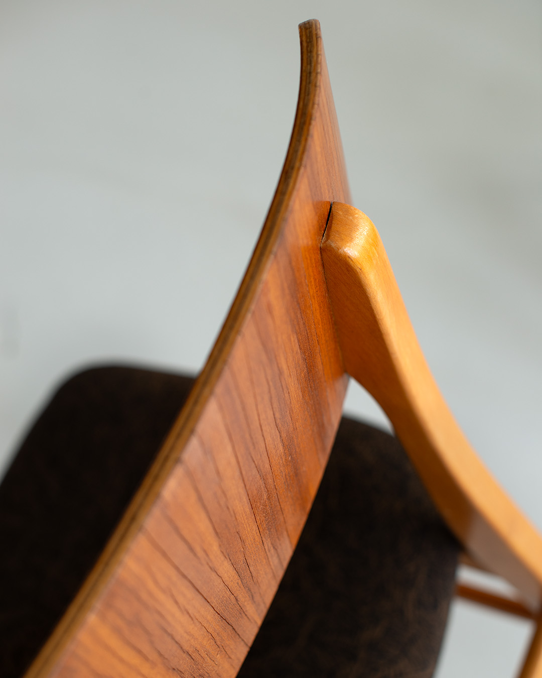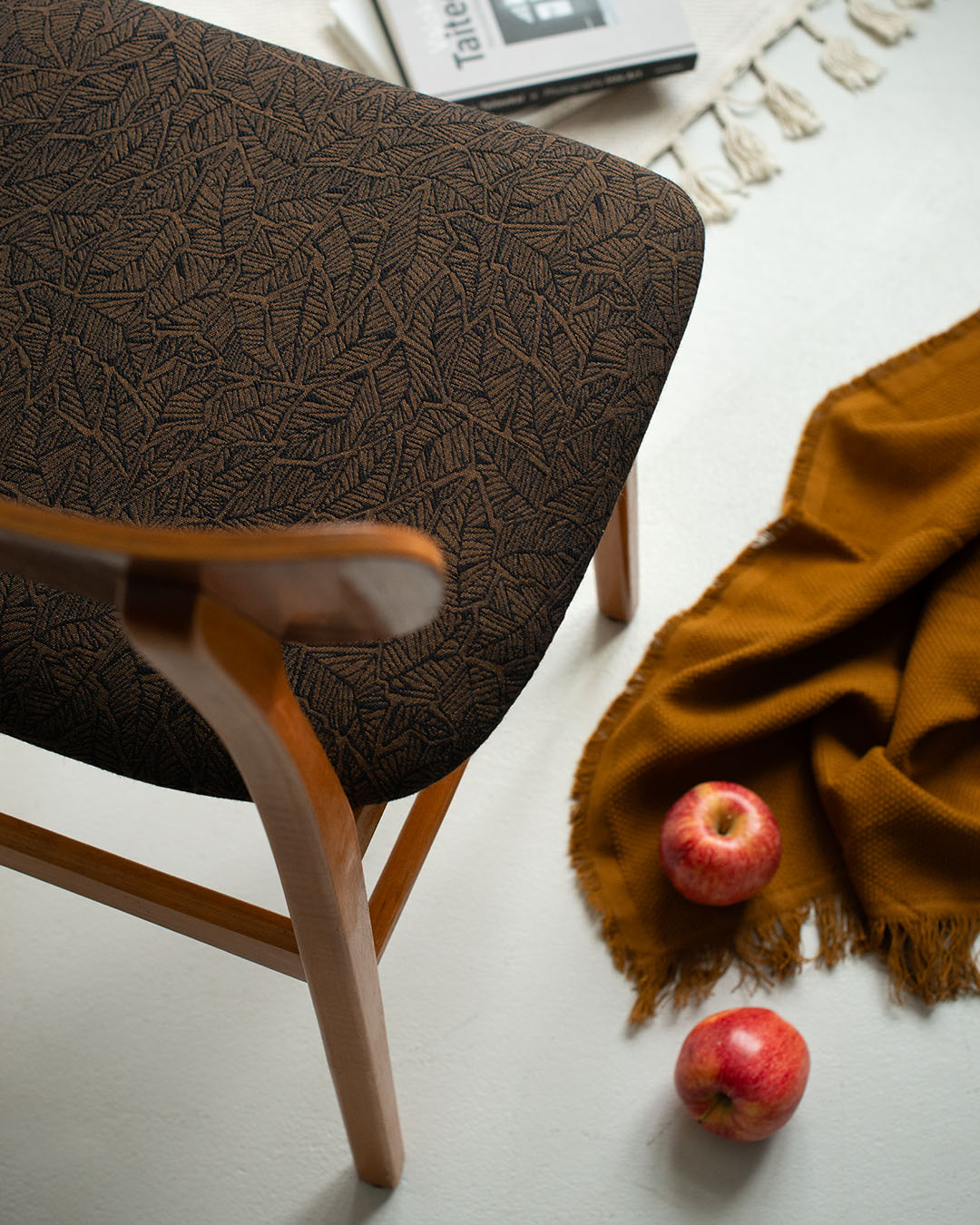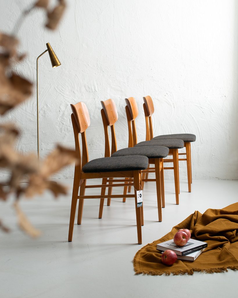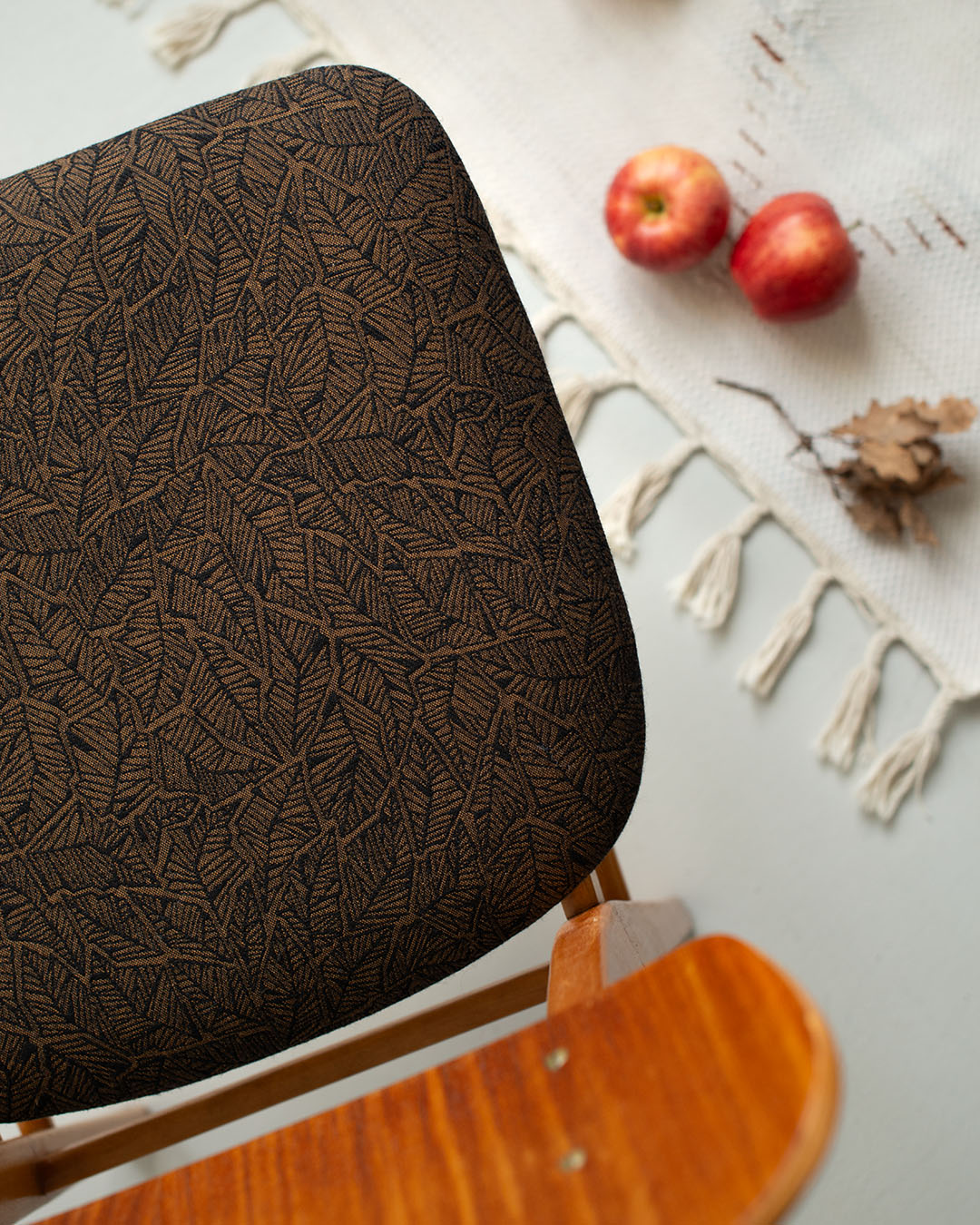 Tuolinelikko 50/60-luvun vaihteesta sai uutta ylleen ja syvyyttä puupinnoille. Istuimet verhoiltiin Havui-kuosilla väreissä curry/musta. Lisäksi pehmusteet vaihdettiin uusiin ja puuosat kirkastettiin sellakalla/puuöljyllä.